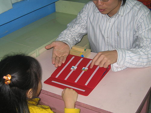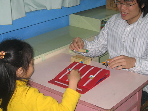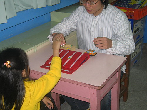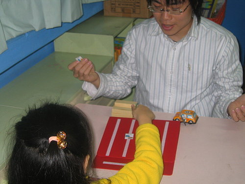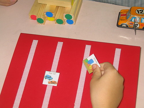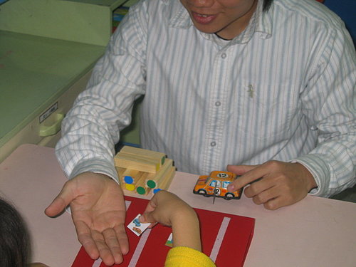 沟通者先诱发沟通后,孩子拿汽车的图卡进行兑换,沟通者不能说出图卡的内容,只进行验证符合的程序,告诉孩子说「给你!」「拿去吧!」,让孩子自己去拿要的物品。
